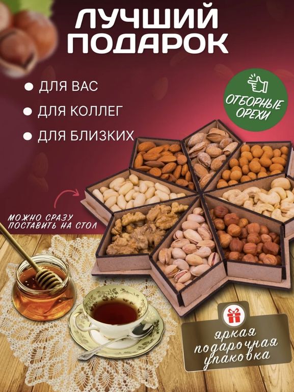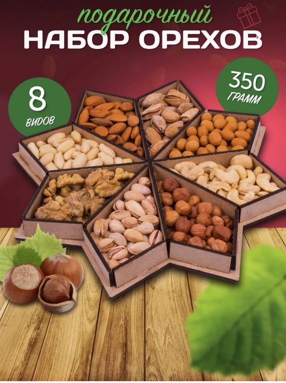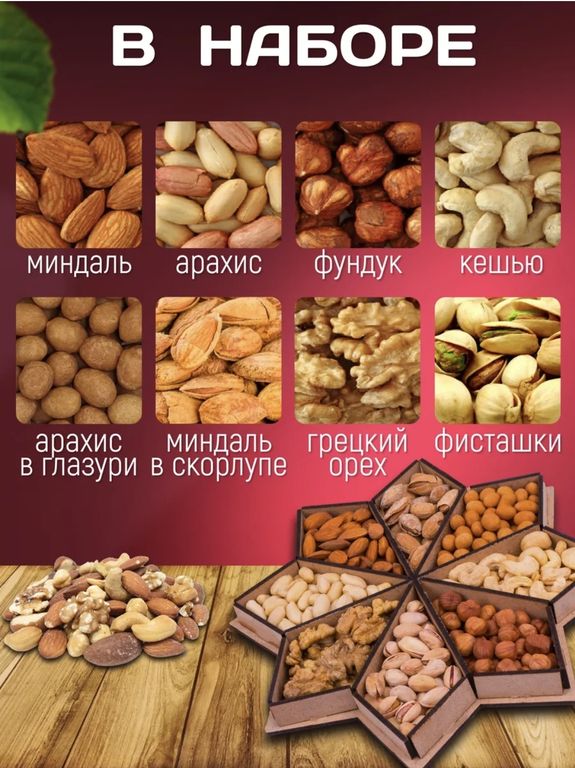 Состав: миндаль, арахис, фундук, кешью, грецкий орех, фисташки, миндаль в скорлупе, арахис в глазури